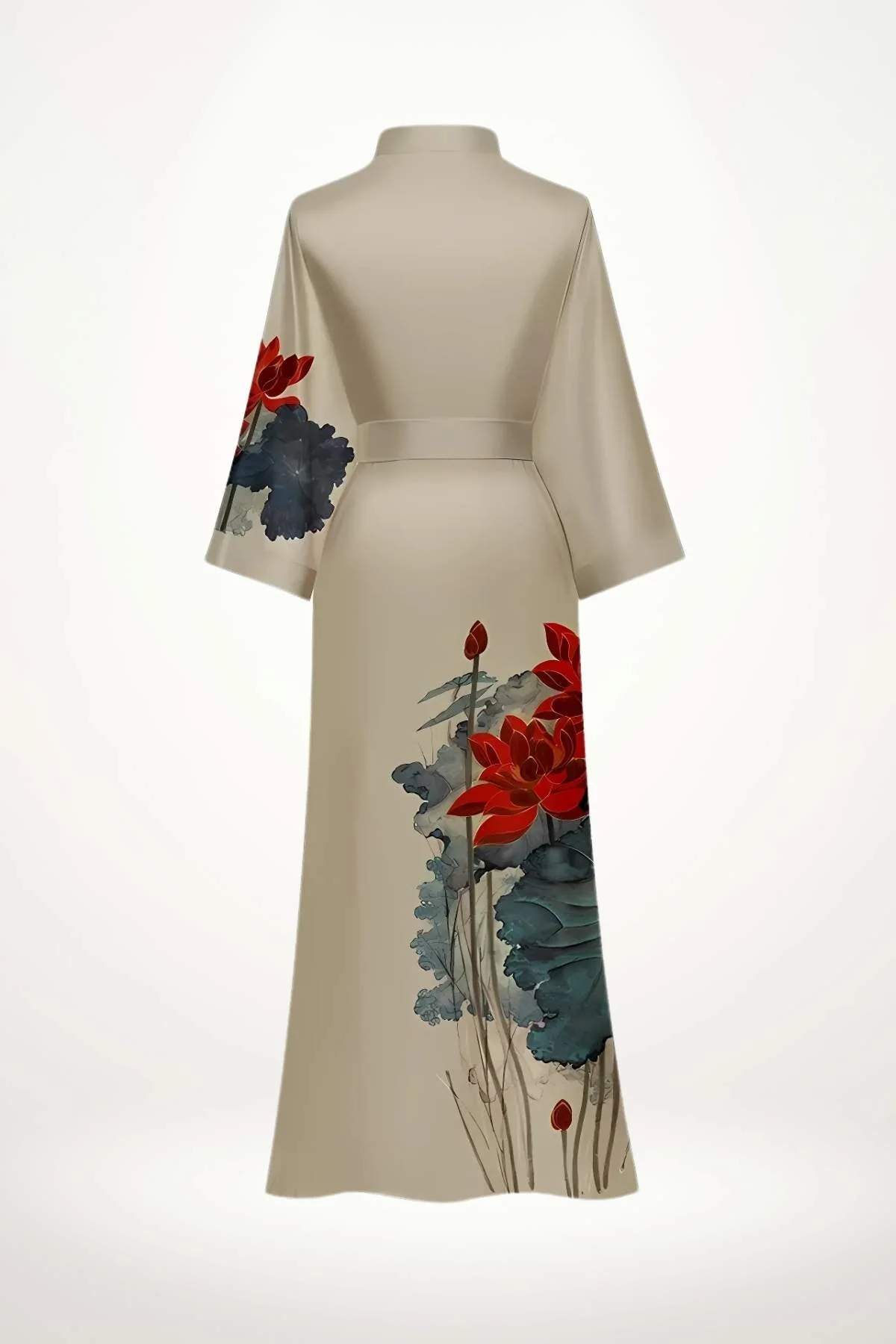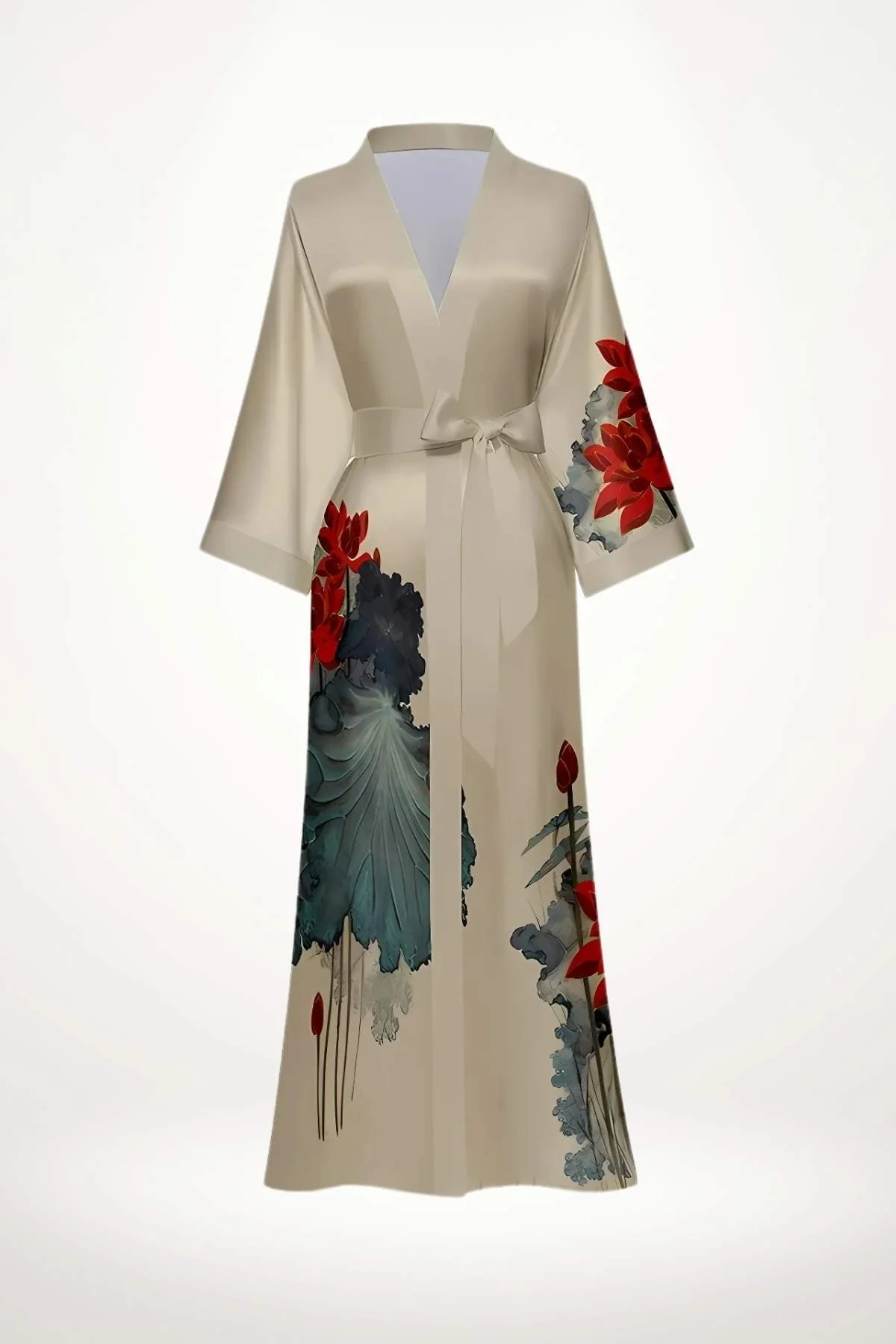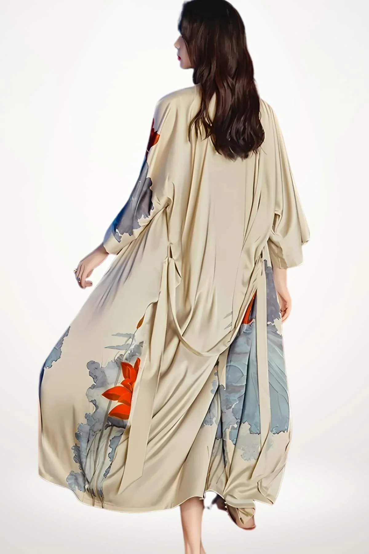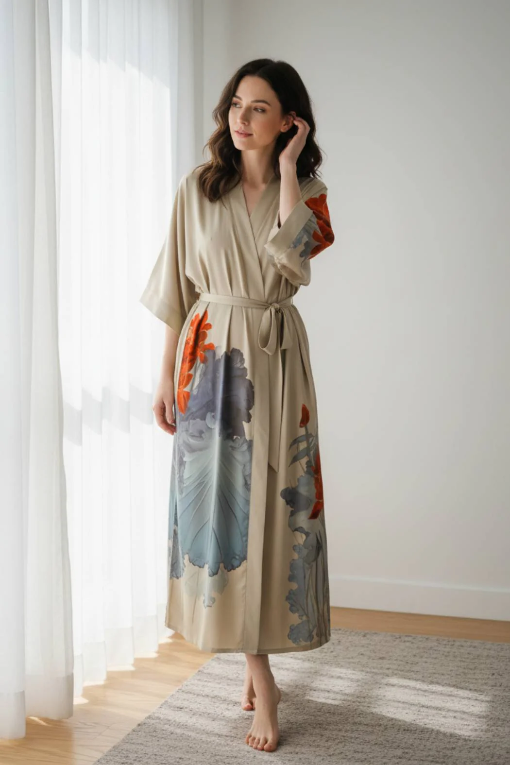 • Style : Le motif floral peint à la main sur fond beige confère à ce kimono satin beige une allure moderne et artistique. La coupe longue fluide, associée à la ceinture obi, structure la silhouette tout en douceur.