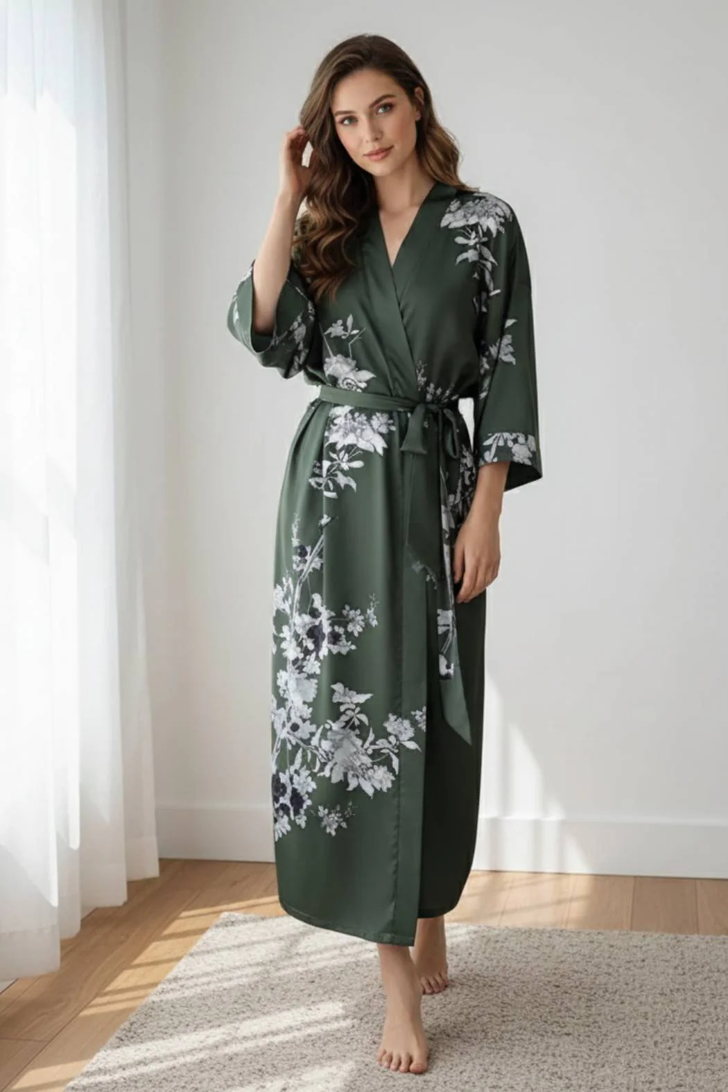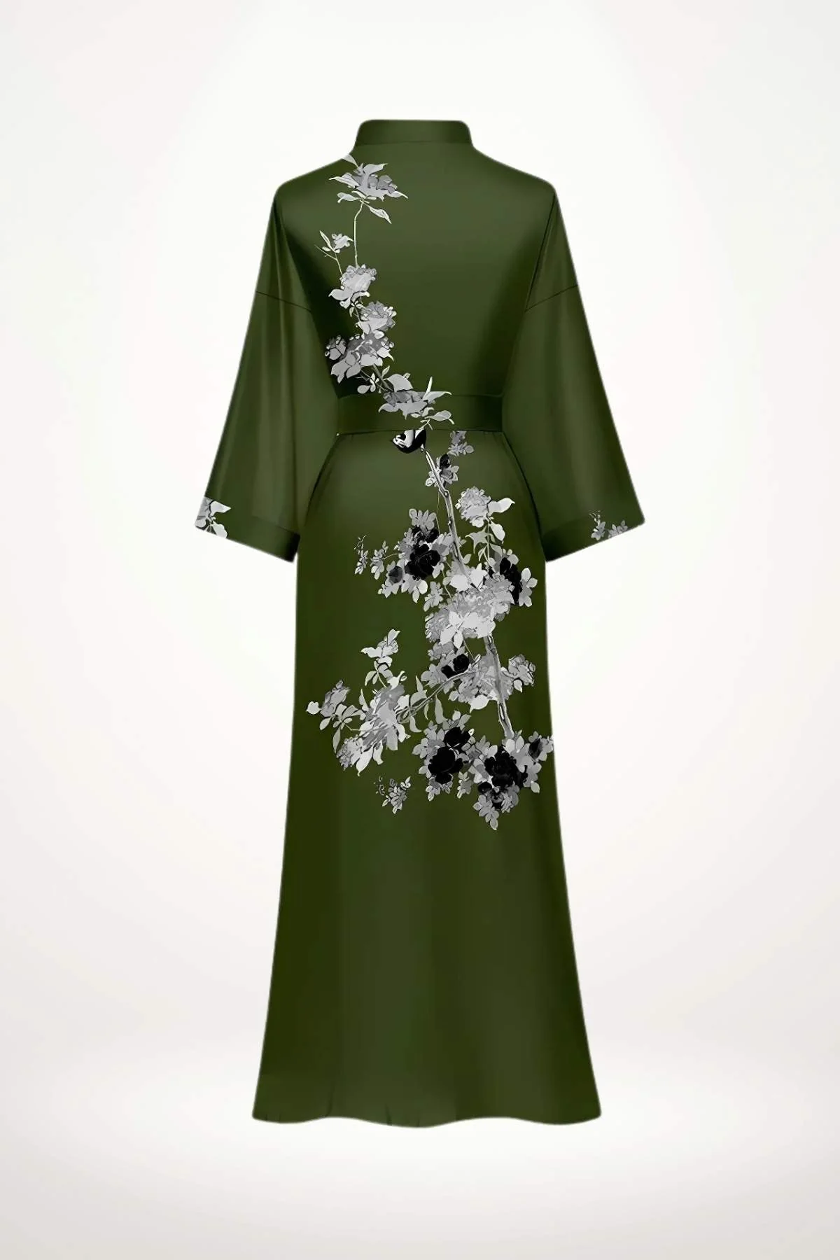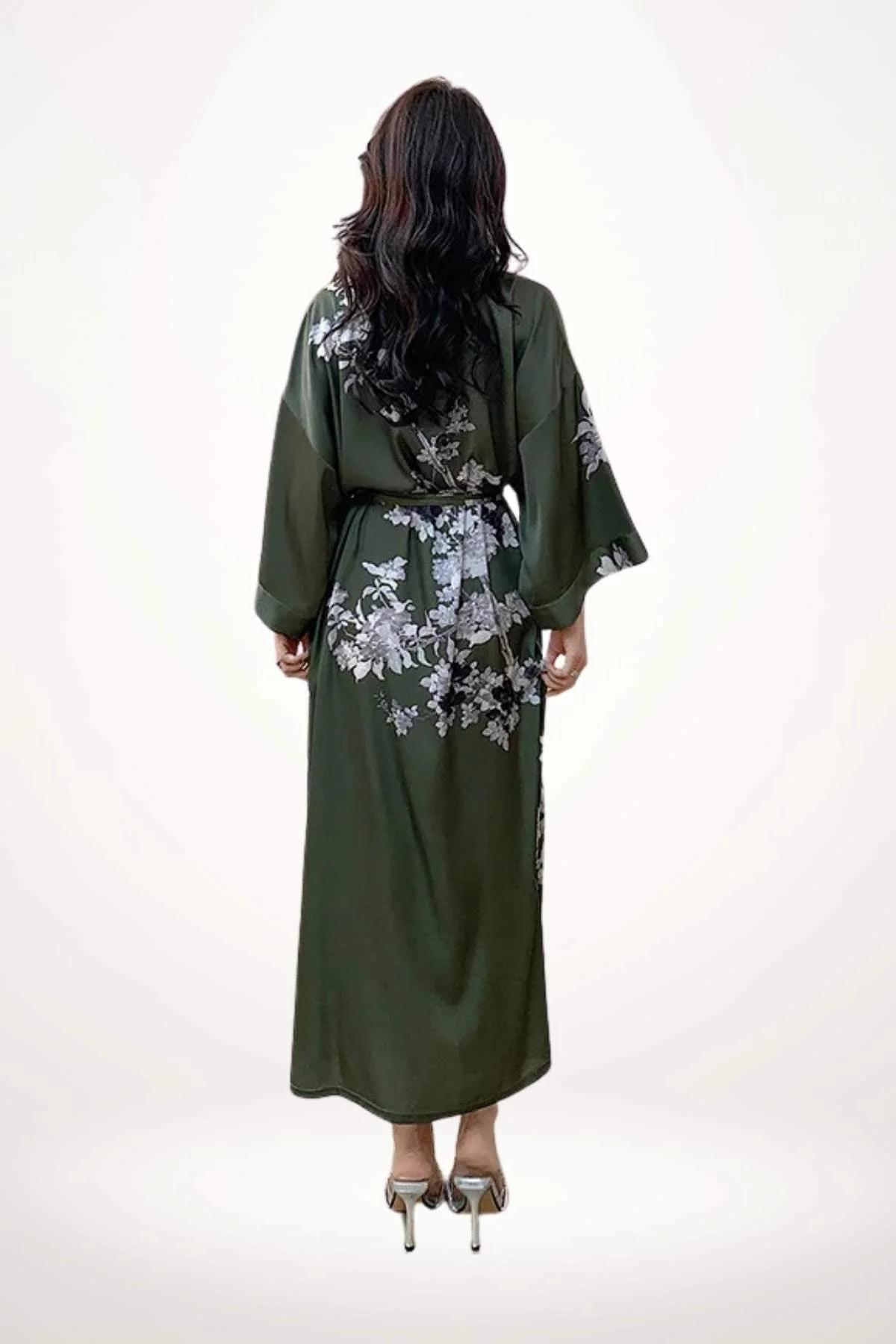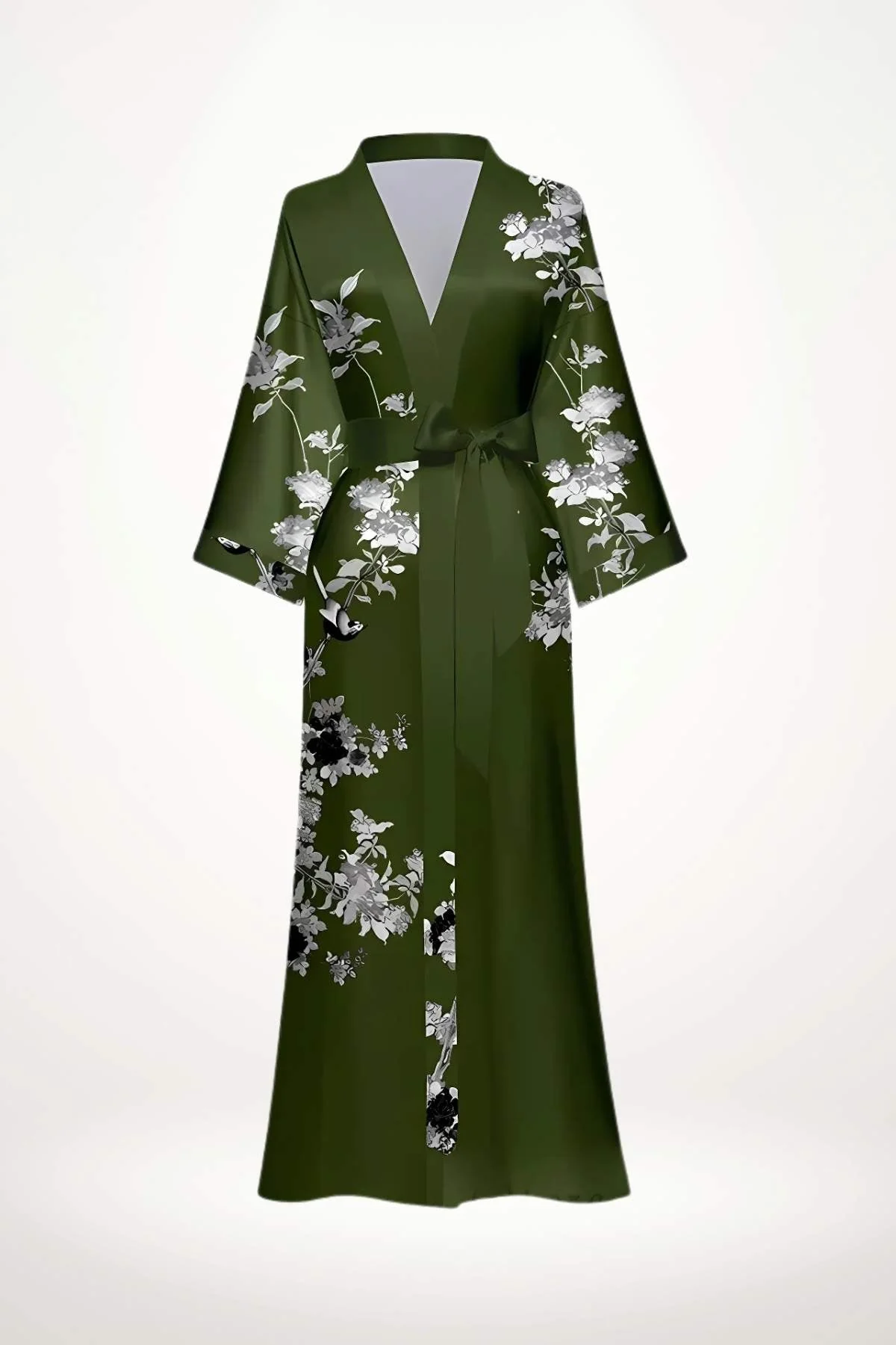 Un kimono long vert aux accents fleuris pour une élégance naturelle
