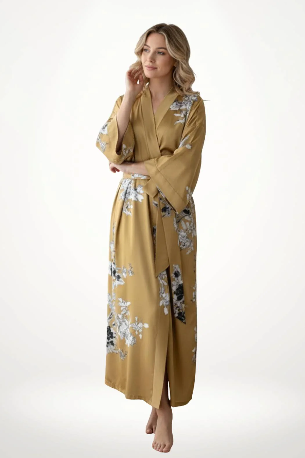 La matière satinée, douce et légère, offre un confort subtil sans sacrifier la tenue, parfait pour une robe kimono chic qui se porte au quotidien avec style.