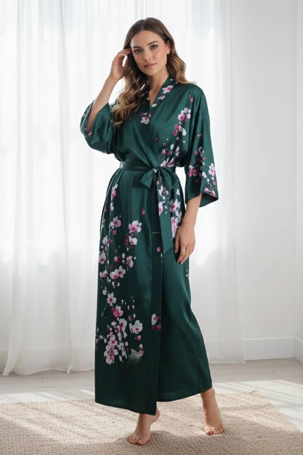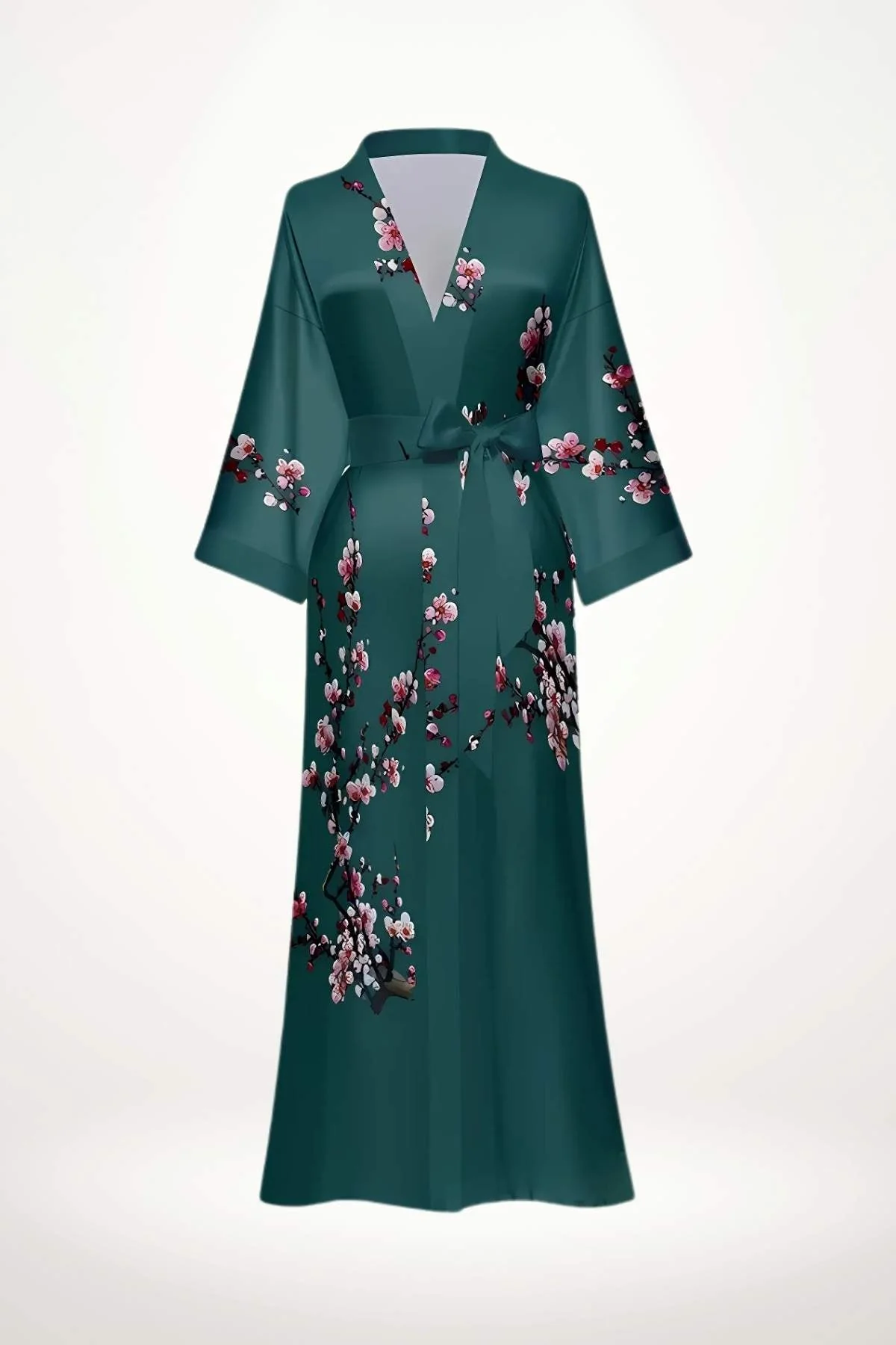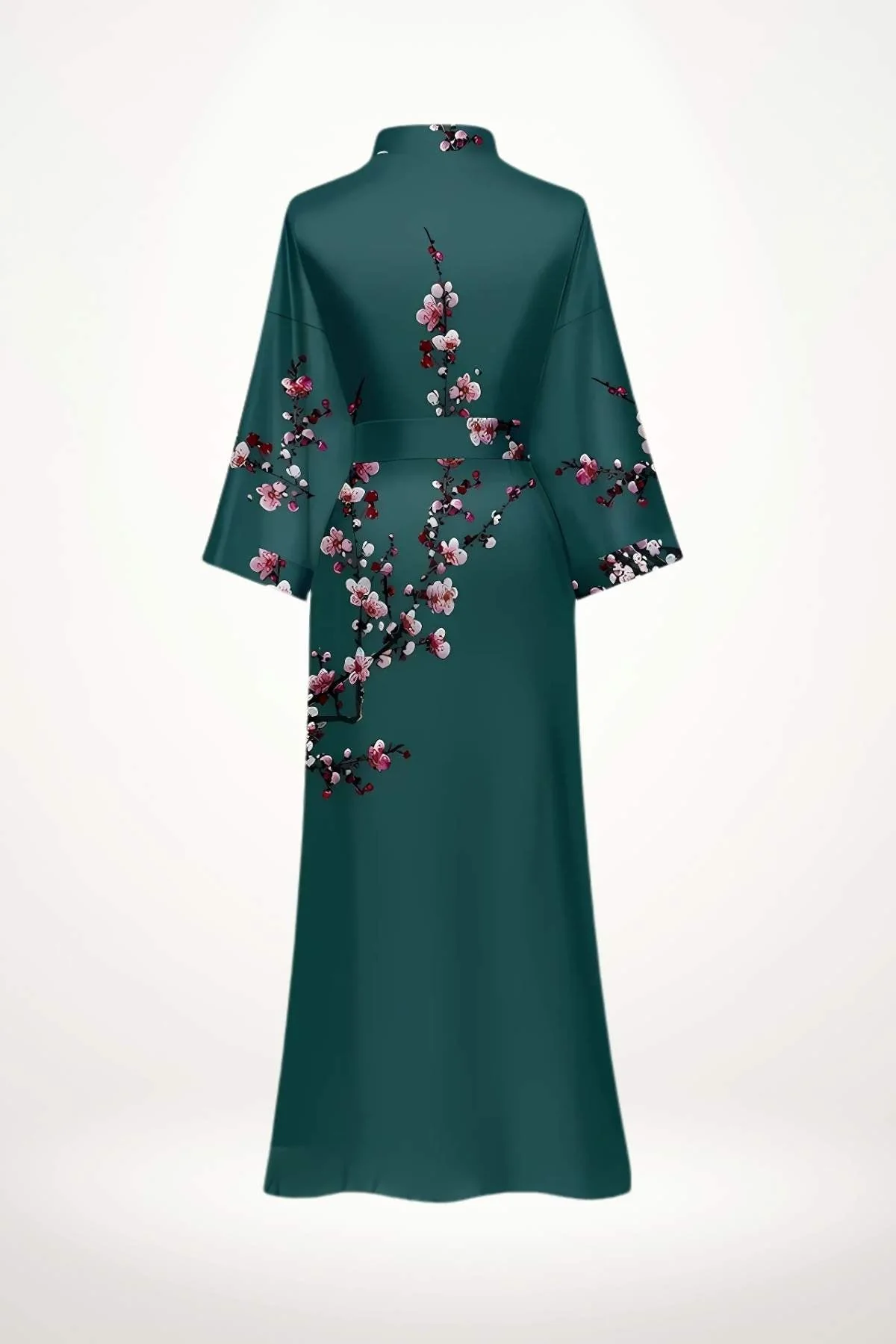 - Émotion : Une sensation de douceur et de sérénité se dégage de ce kimono satiné, où la couleur vert profond se mêle à la poésie des fleurs pour une allure apaisante et sophistiquée.