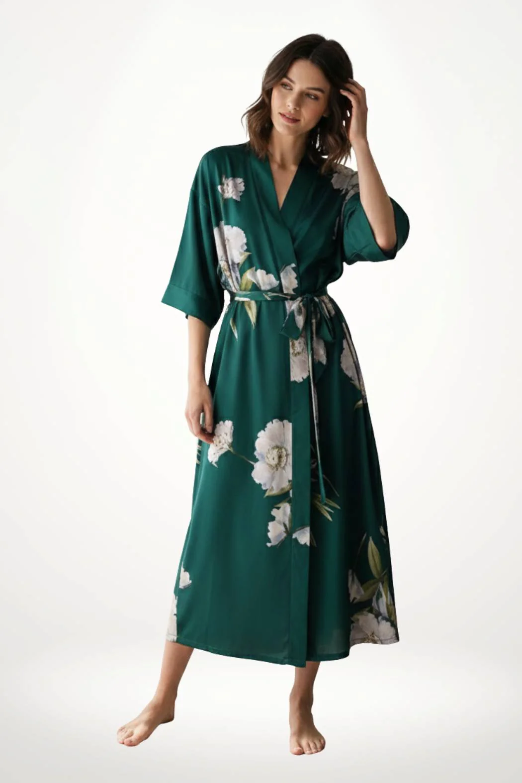 Un kimono long satin vert aux accents floraux délicats